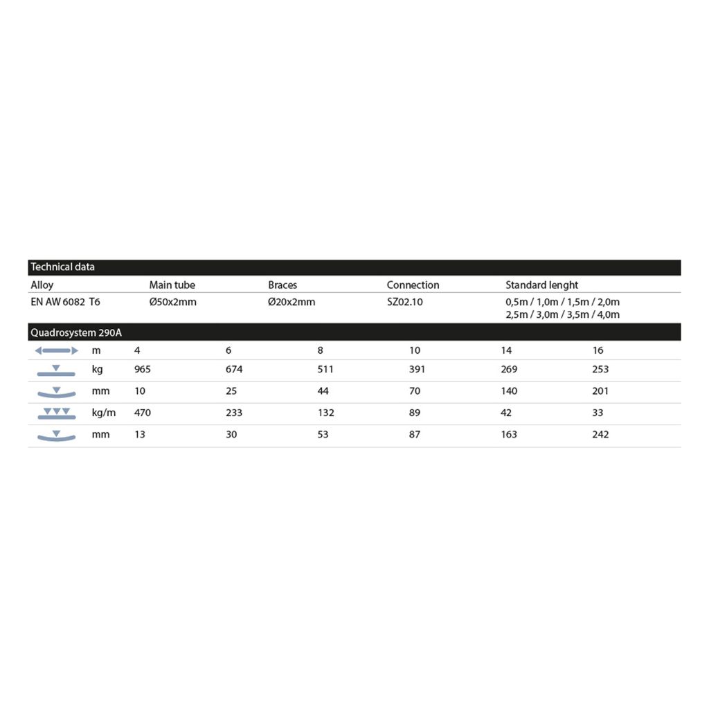 System 290A is made of main tube 50x2mm and braces 20x2mm. It has got SZ02.10 connection.Thanks to their spatial design, the aluminium trusses look attractive and are very strong. They can be arranged in different ways and are successfully used as elements of stage roofs, trade fair structures, exposition structures, big screen structures, LED display screen and projection screen support frames, lighting “gates” and sound “gates”, as well as frameworks of advertising banners or stage decorations. Each truss is of the highest quality which is confirmed by ISO DIN 4113 and TÜV certificate granted to our company. Each element is thoroughly inspected.