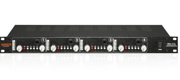 Classic American Console Preamp Design The WA-412 provides 4 channels of classic American console preamps in a sleek 1RU design. This style of preamp is often referred to as “the sound of Rock n’ Roll” for its BIG punchy low end and smooth open top end. The price/performance ratio of the WA-412 is almost unfathomable to the experienced studio engineer who has possibly paid much more for preamps of this style during their career. Featuring fully discrete socketed 6-pin opamps and custom wound Altran USA input and output transformers, the WA-412 leaves nothing to be desired. If you are looking for multiple channels of world class tone in an affordable package, the WA-412 is the right choice for you. 4 CHANNEL MICROPHONE PREAMPLIFIER + INSTRUMENT DI FULLY DISCRETE, TRANSFORMER COUPLED, THROUGH-HOLE COMPONENT TOPOLOGY ALTRAN USA CUSTOM WOUND, PREMIUM INPUT AND OUTPUT TRANSFORMERS X520 DISCRETE OP-AMP IN EVERY CHANNEL, SOCKETED FOR CONVENIENCE. CAN BE USER-REPLACED WITH MOST 6 PIN, DISCRETE OP-AMPS FOR VARYING FLAVOR & TONE 65DB OF GAIN INPUTS – MICROPHONE XLR & ACTIVE INSTRUMENT 2MEG OHM HI-Z OUTPUTS – TRANSFORMER BALANCED XLR & TRS -20DB PAD – PADS BOTH MIC AND INSTRUMENT DI INPUTS TONE BUTTON INPUT IMPEDANCE – SWITCHES FROM 600 OHMS TO 150 OHMS (AFFECTS THE TONE OF BOTH THE MIC AND HI-Z INPUTS) SELF NOISE: <-90DB (NOMINAL) FREQUENCY RESPONSE: 20HZ TO 20KHZ <+/-0.25DB (TONE BUTTON OUT), 20HZ TO 20KHZ +/-2DB (TONE BUTTON IN) +48 VOLT PHANTOM POWER LED METERING OUTPUT TRIM KNOB FOR PRECISE LEVEL CONTROL AND TONE SCULPTING INTERNAL POWER SUPPLY (GROUNDED, 3 PIN IEC CORD)